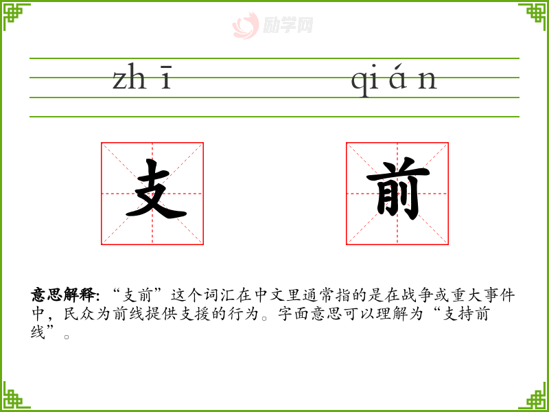 “支前”这个词汇在中文里通常指的是在战争或重大**中,民众为前线提供支援的行为。字面意思可以理解为“支持前线”。