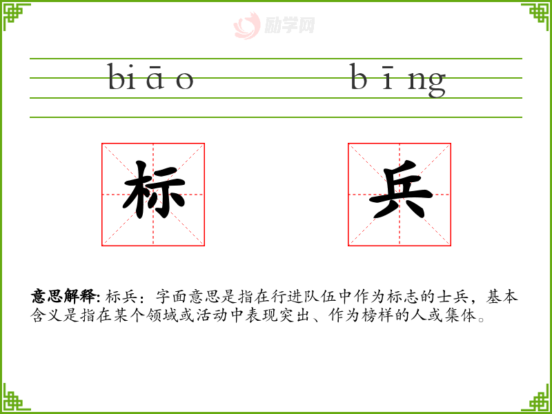 标兵:字面意思是指在行进队伍中作为标志的士兵,基本含义是指在某个领域或活动中表现突出、作为榜样的人或集体。
