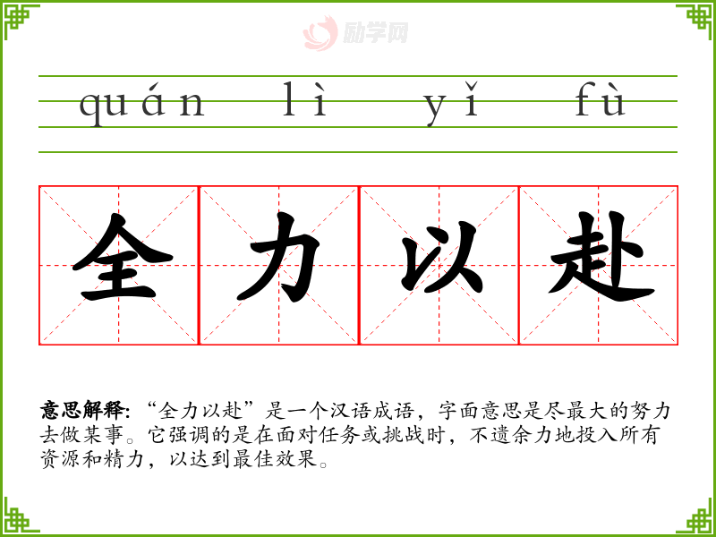 “全力以赴”是一个汉语成语,字面意思是尽最大的努力去做某事。它强调的是在面对任务或挑战时,不遗余力地投入所有资源和精力,以达到最佳效果。