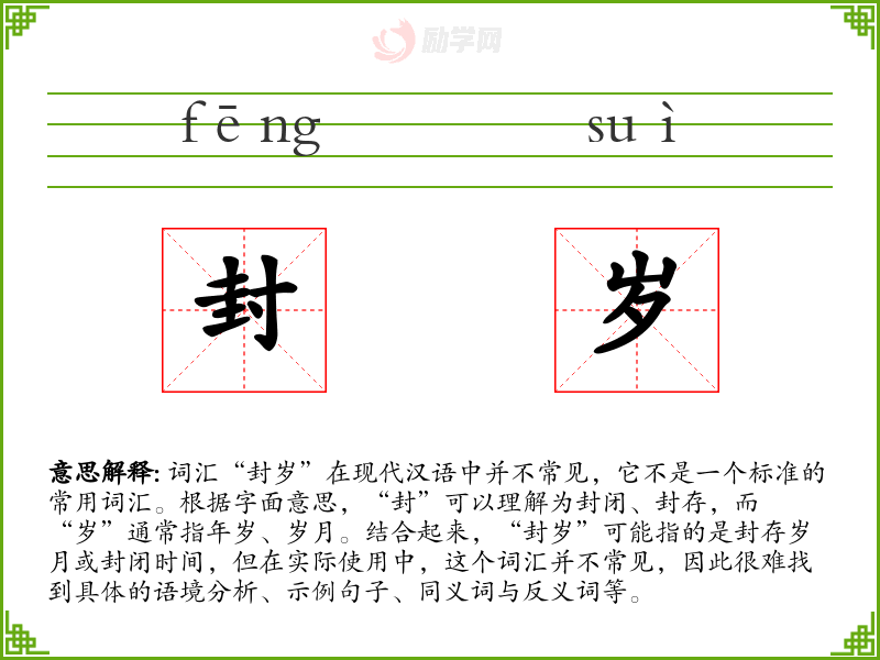 总的来说,“封岁”这个词汇虽然不常见,但其潜在的含义和用法为语言学习和表达提供了有趣的探索方向。
