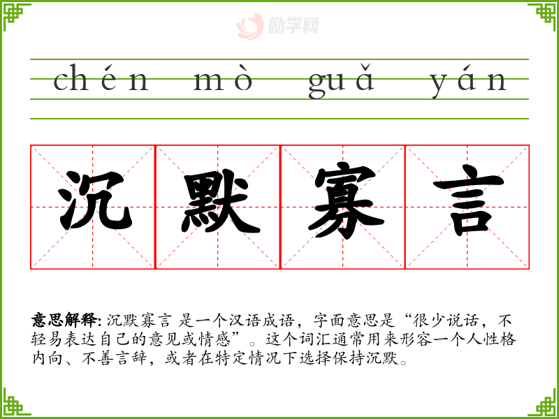 - 口语:在日常对话中,当形容一个人不怎么说话时,可能会直接使用“沉默寡言”这个词。例如,“他是个沉默寡言的人,但一旦开口总能说到点子上。”