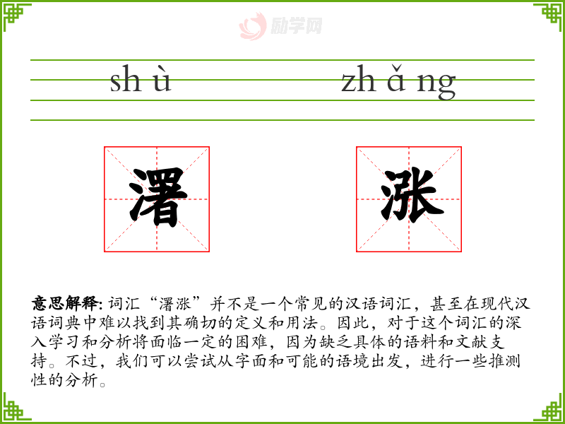 由于“濖涨”不是一个标准词汇,我们无法对其进行深入的理解和总结。在语言学习和表达中,重要的是掌握和使用标准的、有明确意义的词汇,以确保沟通的准确性和有效性。对于不常见的词汇,我们应该谨慎使用,并在必要时寻求专业的解释和指导。
