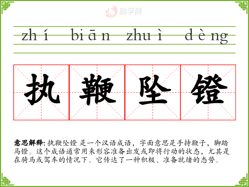 执鞭坠镫 是一个汉语成语,字面意思是手持鞭子,脚踏马镫。这个成语通常用来形容准备出发或即将行动的状态,尤其是在骑马或驾车的情况下。它传达了一种积极、准备就绪的态势。