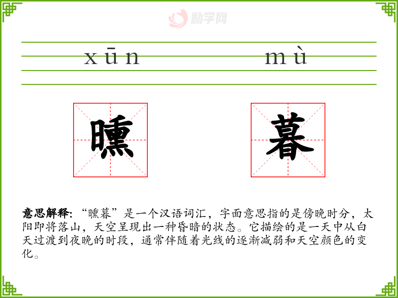 同义词中,“黄昏”和“傍晚”更常用,而“曛暮”则带有一定的文学色彩和古典韵味。反义词则代表了与“曛暮”相对的时间段,即一天的开始。