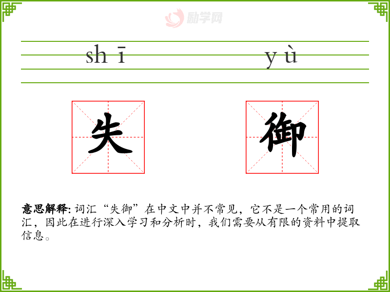 词汇“失御”在中文中并不常见,它不是一个常用的词汇,因此在进行深入学*和分析时,我们需要从有限的资料中提取信息。