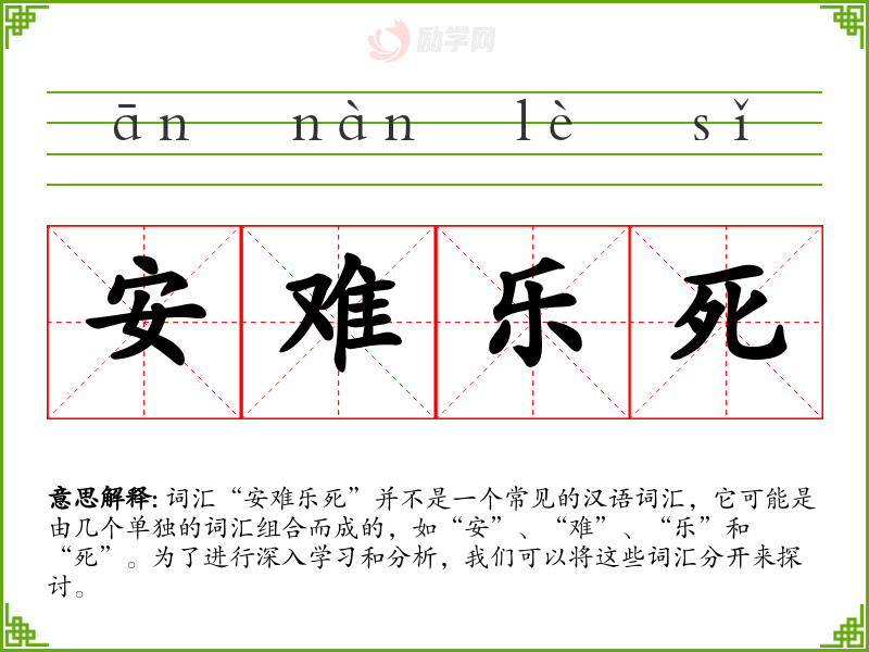 词汇“安难乐死”并不是一个常见的汉语词汇,它可能是由几个单独的词汇组合而成的,如“安”、“难”、“乐”和“死”。为了进行深入学*和分析,我们可以将这些词汇分开来探讨。