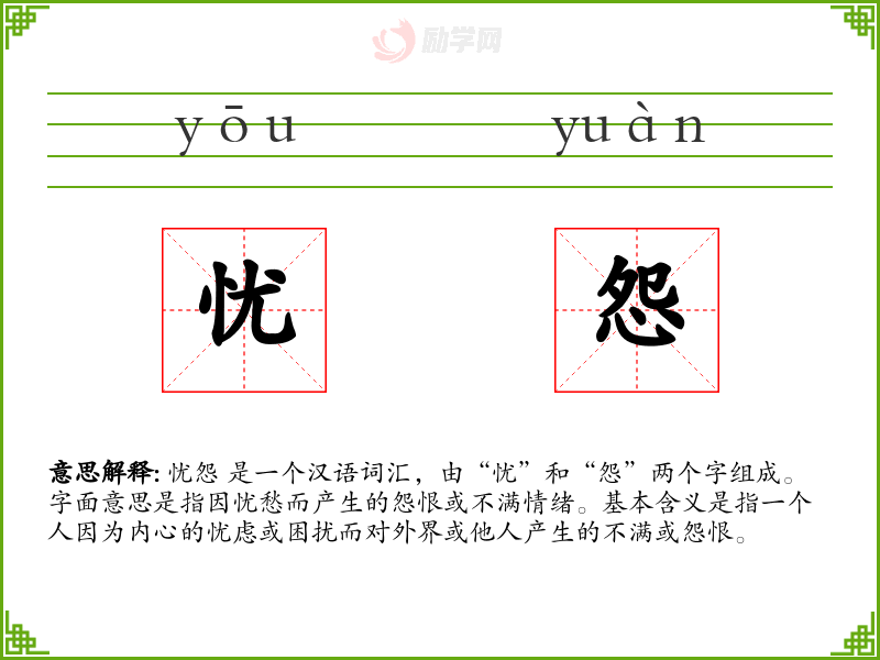 忧怨 是一个汉语词汇,由“忧”和“怨”两个字组成。字面意思是指因忧愁而产生的怨恨或不满情绪。基本含义是指一个人因为内心的忧虑或困扰而对外界或他人产生的不满或怨恨。
