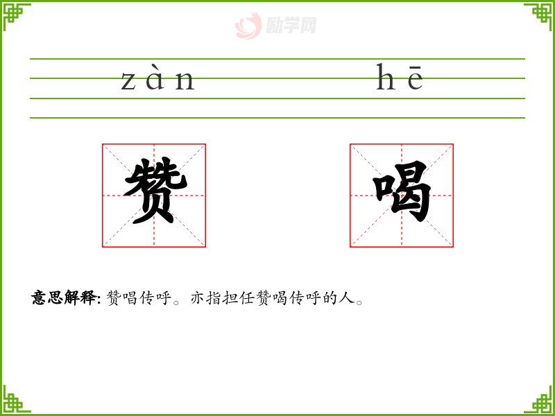 赞喝的意思是:赞唱传呼。亦指担任赞喝传呼的人。