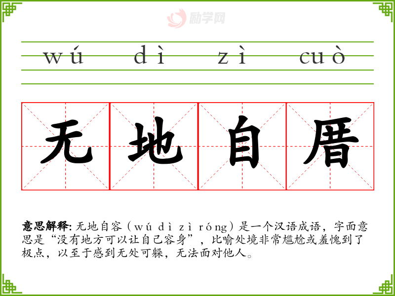 无地自容(wú dì zì róng)是一个汉语成语,字面意思是“没有地方可以让自己容身”,比喻处境非常尴尬或羞愧到了极点,以至于感到无处可躲,无法面对他人。