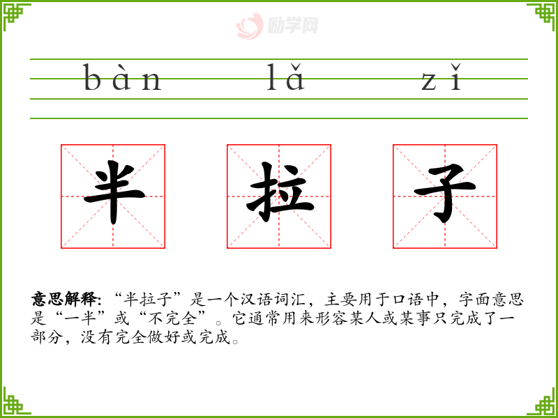 - 口语:在日常对话中,人们常用“半拉子”来形容某人做事不彻底或某件事情只做了一半。