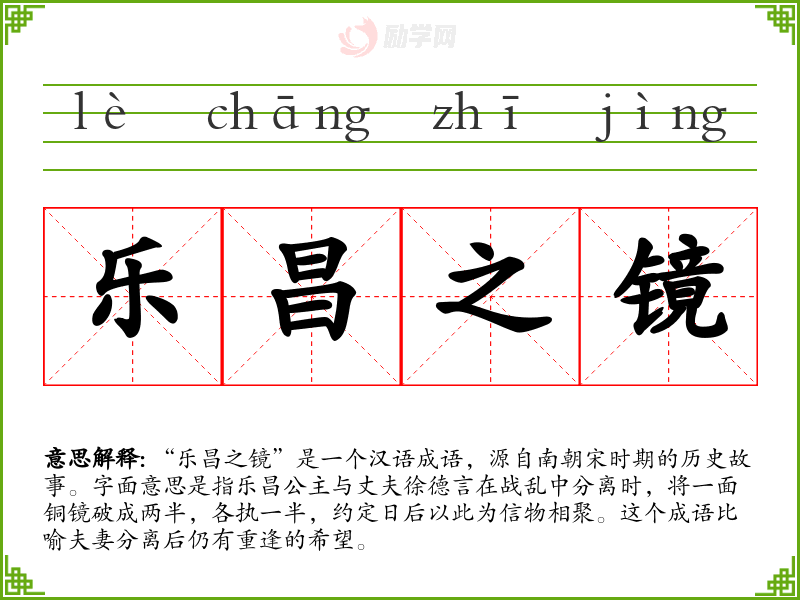 “乐昌之镜”源自南朝宋时期的历史故事,后被广泛应用于文学作品中,成为表达夫妻分离后仍有重逢希望的典型成语。