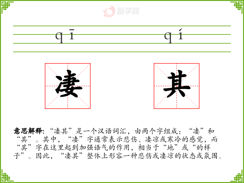 “凄其”是一个富有情感色彩的词汇,适合用于表达深沉的悲伤或凄凉的氛围。在语言学*和表达中,正确使用这样的词汇可以增强文本的情感深度和艺术效果。