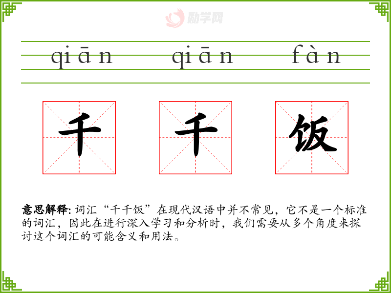 通过对“千千饭”这个词汇的分析,我们可以看到它在语言中的灵活性和可能的象征意义。尽管它不是一个常用词汇,但它可以作为一个有趣的元素,用于文学创作或日常交流中,增添语言的趣味性和丰富性。