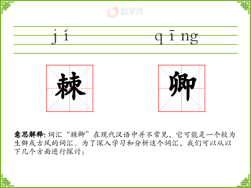 词汇“棘卿”在现代汉语中并不常见,它可能是一个较为生僻或古风的词汇。为了深入学*和分析这个词汇,我们可以从以下几个方面进行探讨: