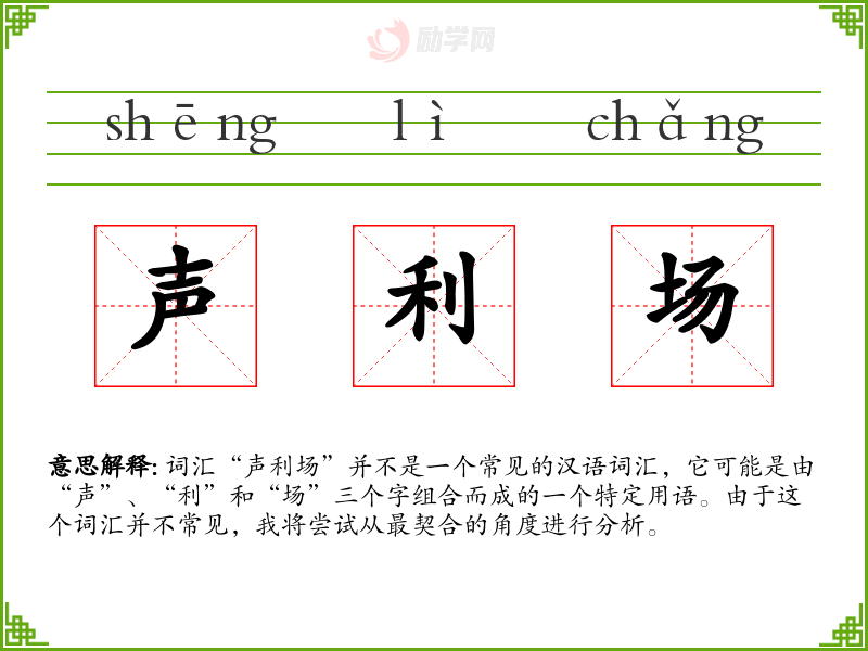 词汇“声利场”并不是一个常见的汉语词汇,它可能是由“声”、“利”和“场”三个字组合而成的一个特定用语。由于这个词汇并不常见,我将尝试从最契合的角度进行分析。