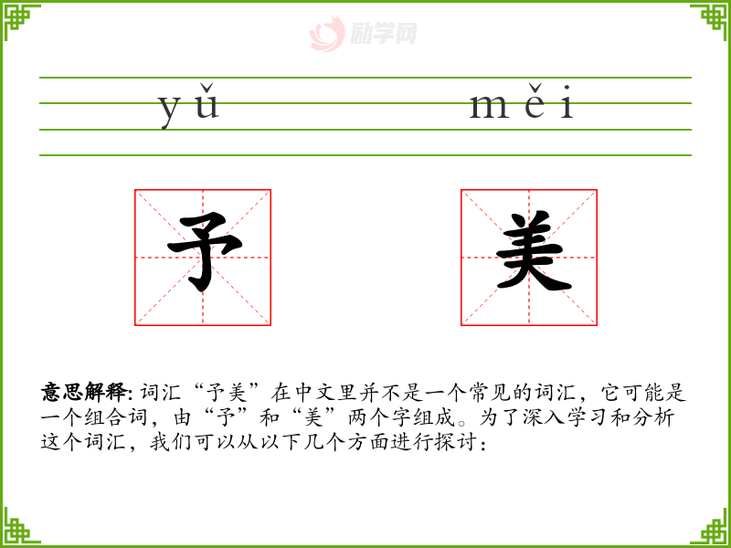 词汇“予美”在中文里并不是一个常见的词汇,它可能是一个组合词,由“予”和“美”两个字组成。为了深入学*和分析这个词汇,我们可以从以下几个方面进行探讨: