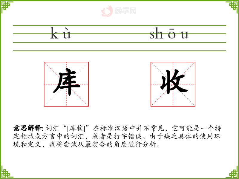 综上所述,词汇“[库收]”在标准汉语中并不存在,因此无法进行深入的学习和分析。如果这是一个特定领域或方言中的词汇,建议提供更多的上下文信息以便进行准确的分析。