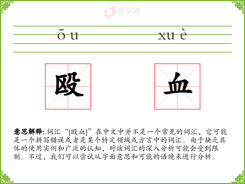 - 对于“殴血”这个词汇的分析受到其不常见和缺乏具体使用实例的限制。在语言学习和表达中,了解常见词汇的准确含义和用法更为重要。如果“殴血”是一个特定领域的术语,了解其在该领域的具体含义和用法将有助于更好地理解和应用。