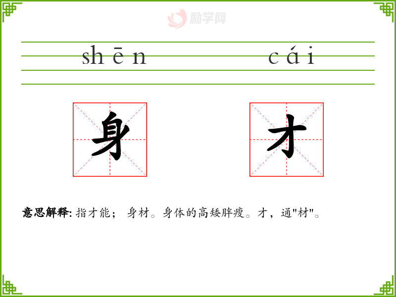 身才的意思是:指才能; 身材。身体的高矮胖瘦。才,通"材"。