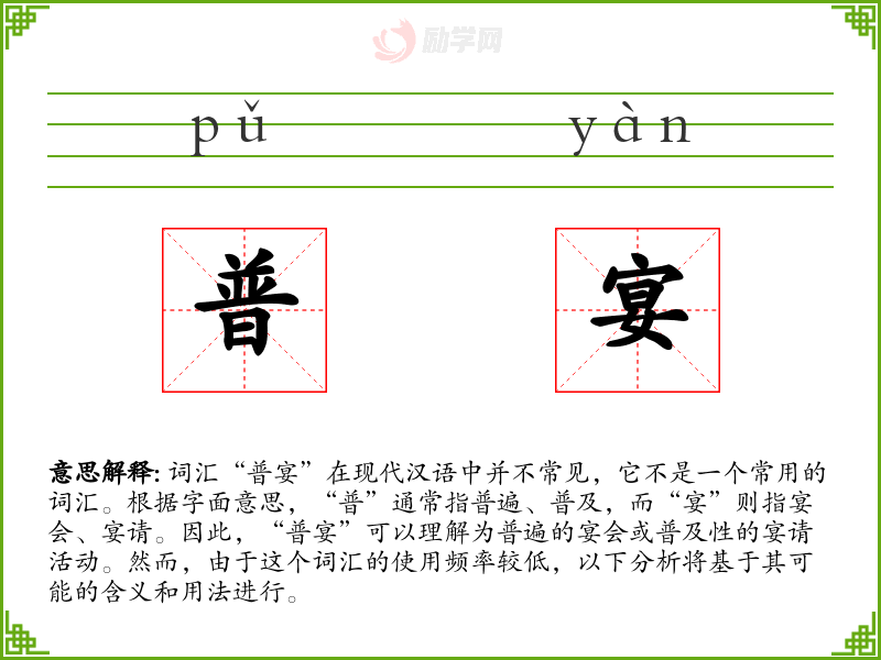 词汇“普宴”在现代汉语中并不常见,它不是一个常用的词汇。根据字面意思,“普”通常指普遍、普及,而“宴”则指宴会、宴请。因此,“普宴”可以理解为普遍的宴会或普及性的宴请活动。然而,由于这个词汇的使用频率较低,以下分析将基于其可能的含义和用法进行。