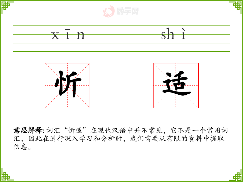 词汇“忻适”在现代汉语中并不常见,它不是一个常用词汇,因此在进行深入学习和分析时,我们需要从有限的资料中提取信息。