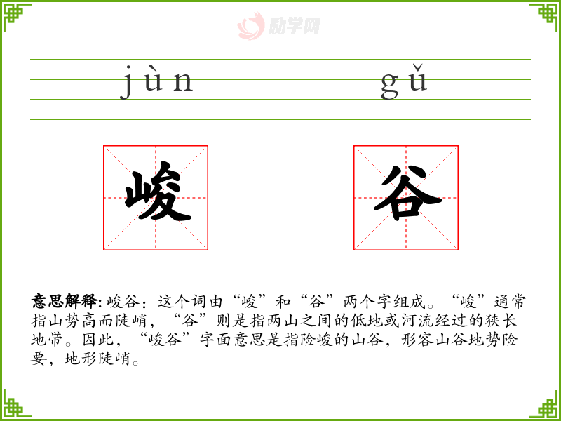“峻”字古已有之,源自《说文解字》,意为山高而陡。“谷”字同样古老,指山间低地。两者结合,形成了描述特定地形的词汇“峻谷”。
