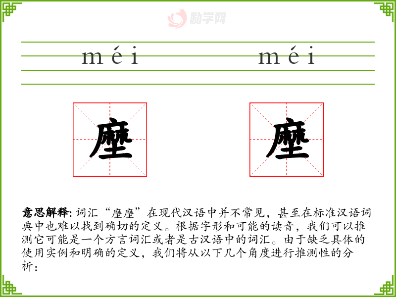 词汇“塺塺”在现代汉语中并不常见,甚至在标准汉语词典中也难以找到确切的定义。根据字形和可能的读音,我们可以推测它可能是一个方言词汇或者是古汉语中的词汇。由于缺乏具体的使用实例和明确的定义,我们将从以下几个角度进行推测性的分析: