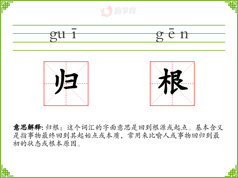 归根:这个词汇的字面意思是回到根源或起点。基本含义是指事物最终回到其起始点或本质,常用来比喻人或事物回归到最初的状态或根本原因。