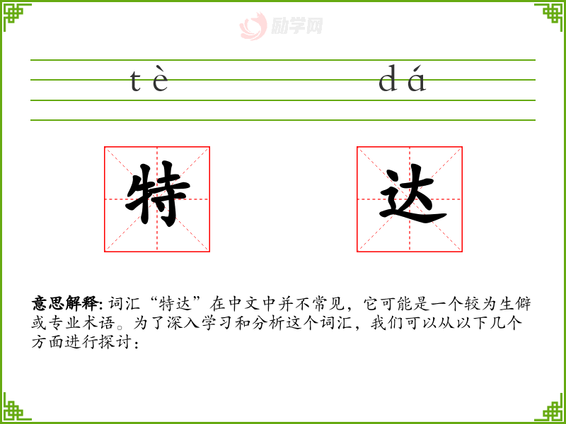 词汇“特达”在中文中并不常见,它可能是一个较为生僻或专业术语。为了深入学习和分析这个词汇,我们可以从以下几个方面进行探讨: