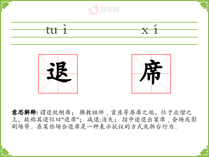 谓退就侧席; 佛教祖师﹑首座等居席之端,位于众僧之上,故称其退位曰"退席"; 减退;消失; 指中途退出宴席﹑会场或影剧场等。在某些场合退席是一种表示抗议的方式或拆台行为。