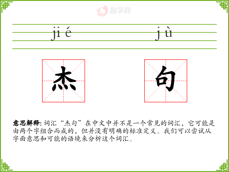 词汇“杰句”在中文中并不是一个常见的词汇,它可能是由两个字组合而成的,但并没有明确的标准定义。我们可以尝试从字面意思和可能的语境来分析这个词汇。