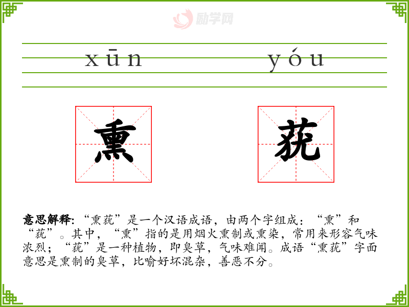 “熏莸”是一个汉语成语,由两个字组成:“熏”和“莸”。其中,“熏”指的是用烟火熏制或熏染,常用来形容气味浓烈;“莸”是一种植物,即臭草,气味难闻。成语“熏莸”字面意思是熏制的臭草,比喻好坏混杂,善恶不分。