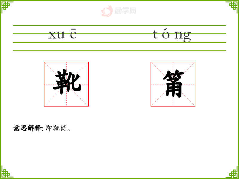 靴[ xuē ] 1. (形声。从革,化声。革,皮革。本义:高到踝骨以上的长筒鞋) 同本义。 【引证】 《晋书》-尝有人著靴骑驴,至兆门外。 【组词】 靴叶子、 靴桶、 靴衫、 靴袍 [更多解释]