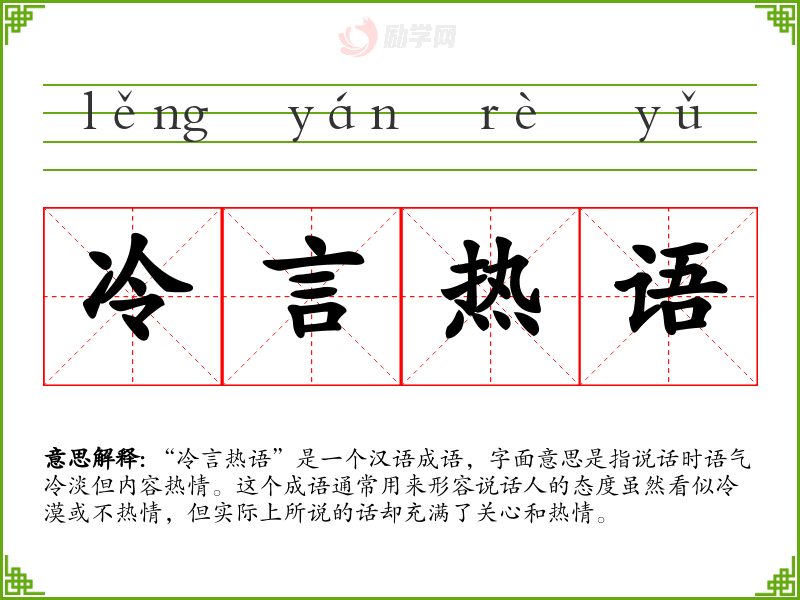 “冷言热语”是一个汉语成语,字面意思是指说话时语气冷淡但内容热情。这个成语通常用来形容说话人的态度虽然看似冷漠或不热情,但实际上所说的话却充满了关心和热情。