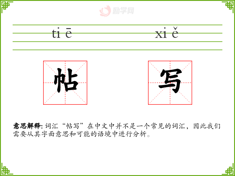 词汇“帖写”在中文中并不是一个常见的词汇,因此我们需要从其字面意思和可能的语境中进行分析。