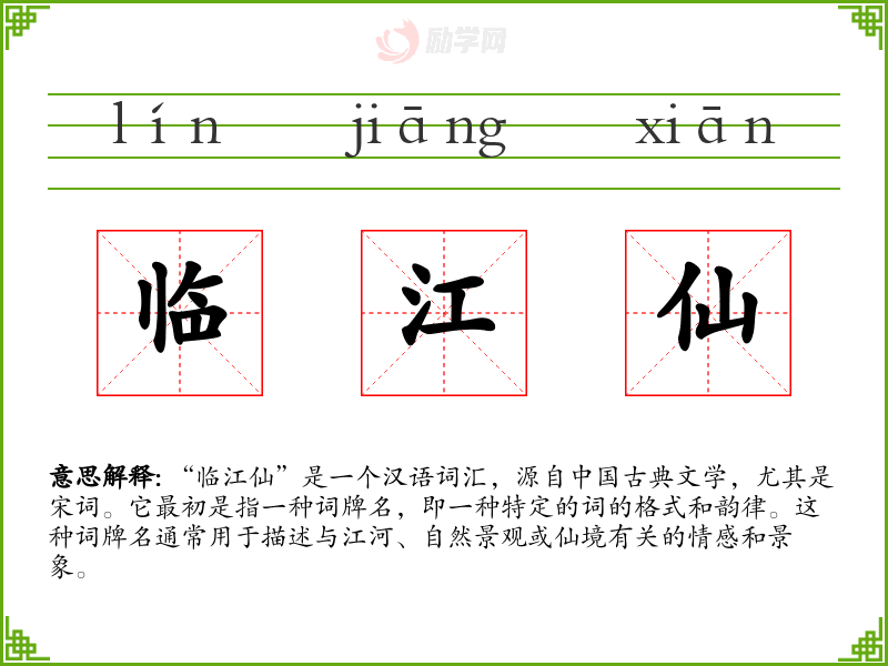 “临江仙”是一个汉语词汇,源自**古典文学,尤其是宋词。它最初是指一种词牌名,即一种特定的词的格式和韵律。这种词牌名通常用于描述与江河、自然景观或仙境有关的情感和景象。