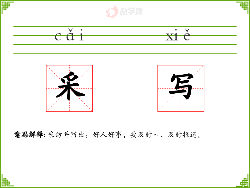 采写的意思是:采访并写出:好人好事,要及时~,及时报道。