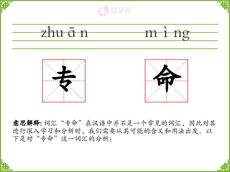 词汇“专命”在汉语中并不是一个常见的词汇,因此对其进行深入学习和分析时,我们需要从其可能的含义和用法出发。以下是对“专命”这一词汇的分析: