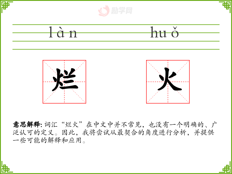 词汇“烂火”在中文中并不常见,也没有一个明确的、广泛认可的定义。因此,我将尝试从最契合的角度进行分析,并提供一些可能的解释和应用。