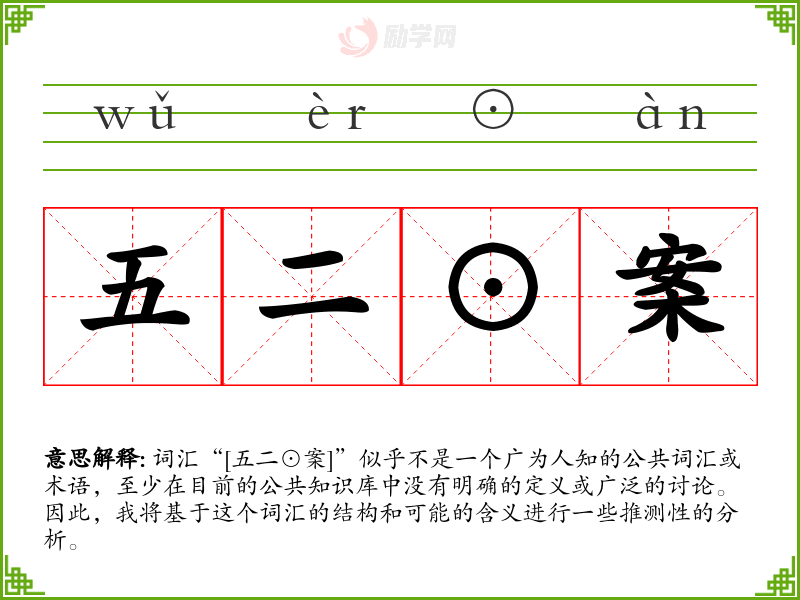 由于“[五二⊙案]”不是一个标准词汇,我们无法给出确切的字面意思和基本含义。它可能是一个特定领域或社群内部使用的术语,或者是一个特定**的代号。