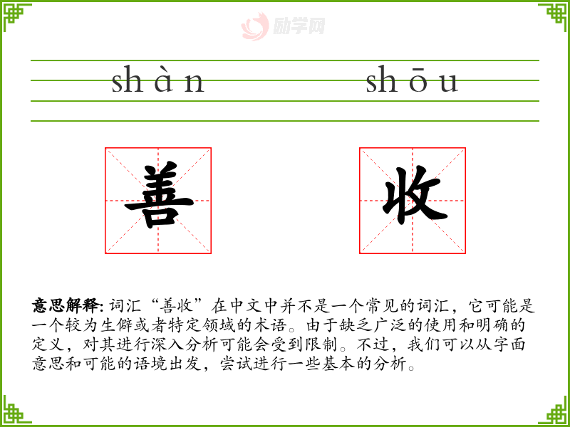 词汇“善收”在中文中并不是一个常见的词汇,它可能是一个较为生僻或者特定领域的术语。由于缺乏广泛的使用和明确的定义,对其进行深入分析可能会受到限制。不过,我们可以从字面意思和可能的语境出发,尝试进行一些基本的分析。