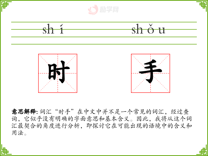 由于“时手”不是一个标准词汇,我们无法给出一个确切的基本定义。它可能是由“时”和“手”两个字组合而成的,但这种组合在中文中并没有固定的意义。