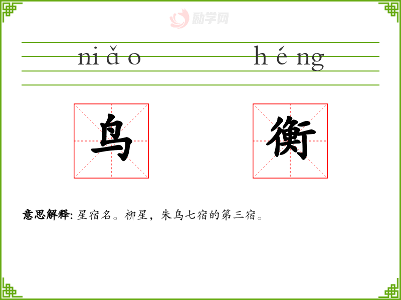 鸟衡的意思是:星宿名。柳星,朱鸟七宿的第三宿。