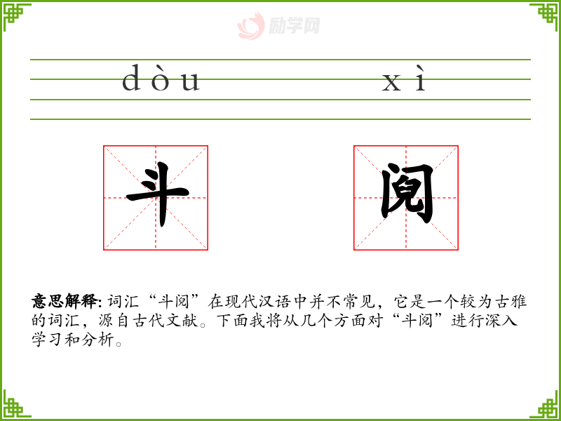 词汇“斗阋”在现代汉语中并不常见,它是一个较为古雅的词汇,源自古代文献。下面我将从几个方面对“斗阋”进行深入学习和分析。