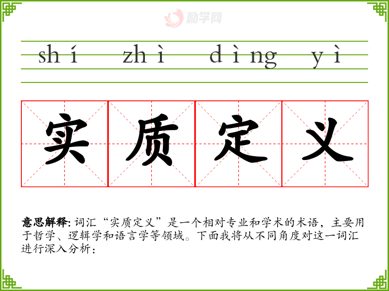 词汇“实质定义”是一个相对专业和学术的术语,主要用于哲学、逻辑学和语言学等领域。下面我将从不同角度对这一词汇进行深入分析: