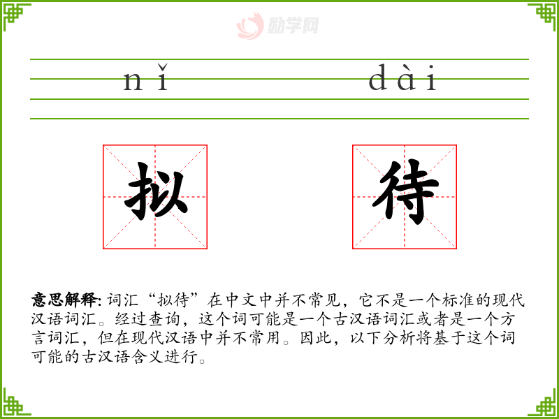 词汇“拟待”在中文中并不常见,它不是一个标准的现代汉语词汇。经过查询,这个词可能是一个古汉语词汇或者是一个方言词汇,但在现代汉语中并不常用。因此,以下分析将基于这个词可能的古汉语含义进行。