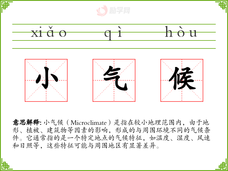 - 反义词:大气候(Macroclimate),指较大地理范围内的气候条件。