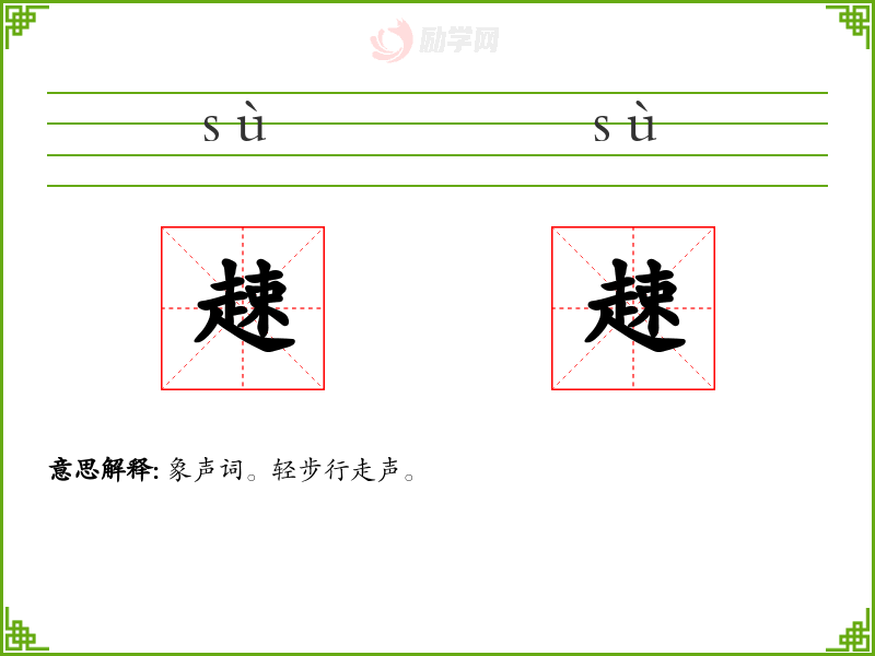 趚[ sù ] 1. 〔~~〕跑动的声音,如“麀鹿~~。”。 [更多解释]