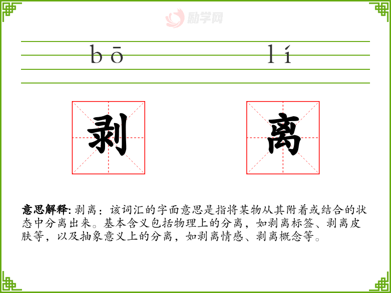 剥离:该词汇的字面意思是指将某物从其附着或结合的状态中分离出来。基本含义包括物理上的分离,如剥离标签、剥离皮肤等,以及抽象意义上的分离,如剥离情感、剥离概念等。