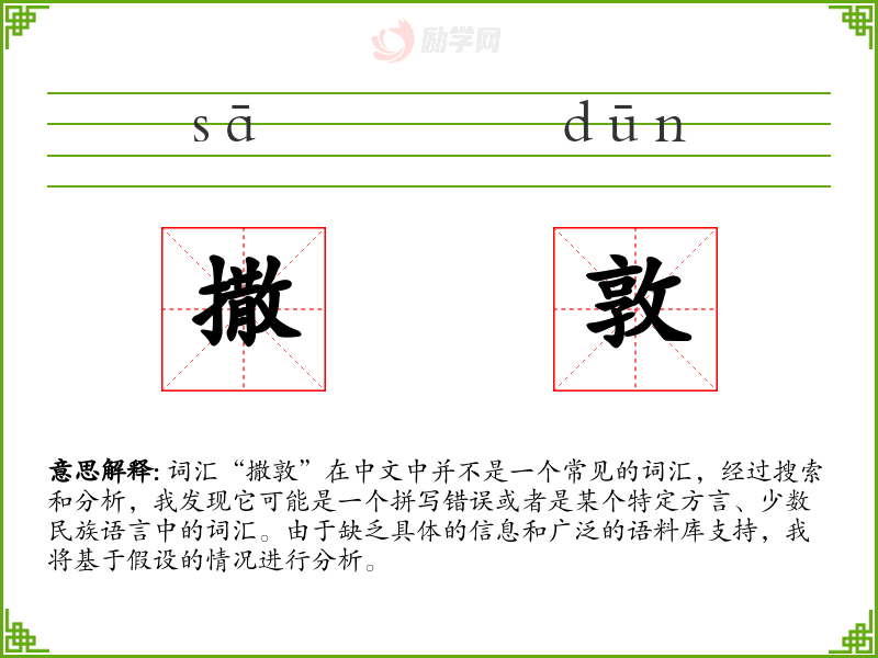由于“撒敦”不是一个已知的词汇,对其的理解和分析非常有限。在语言学习和表达中,了解词汇的准确含义和使用场景是非常重要的。对于不熟悉的词汇,应当寻求专业的语言学支持或具体的语境信息。